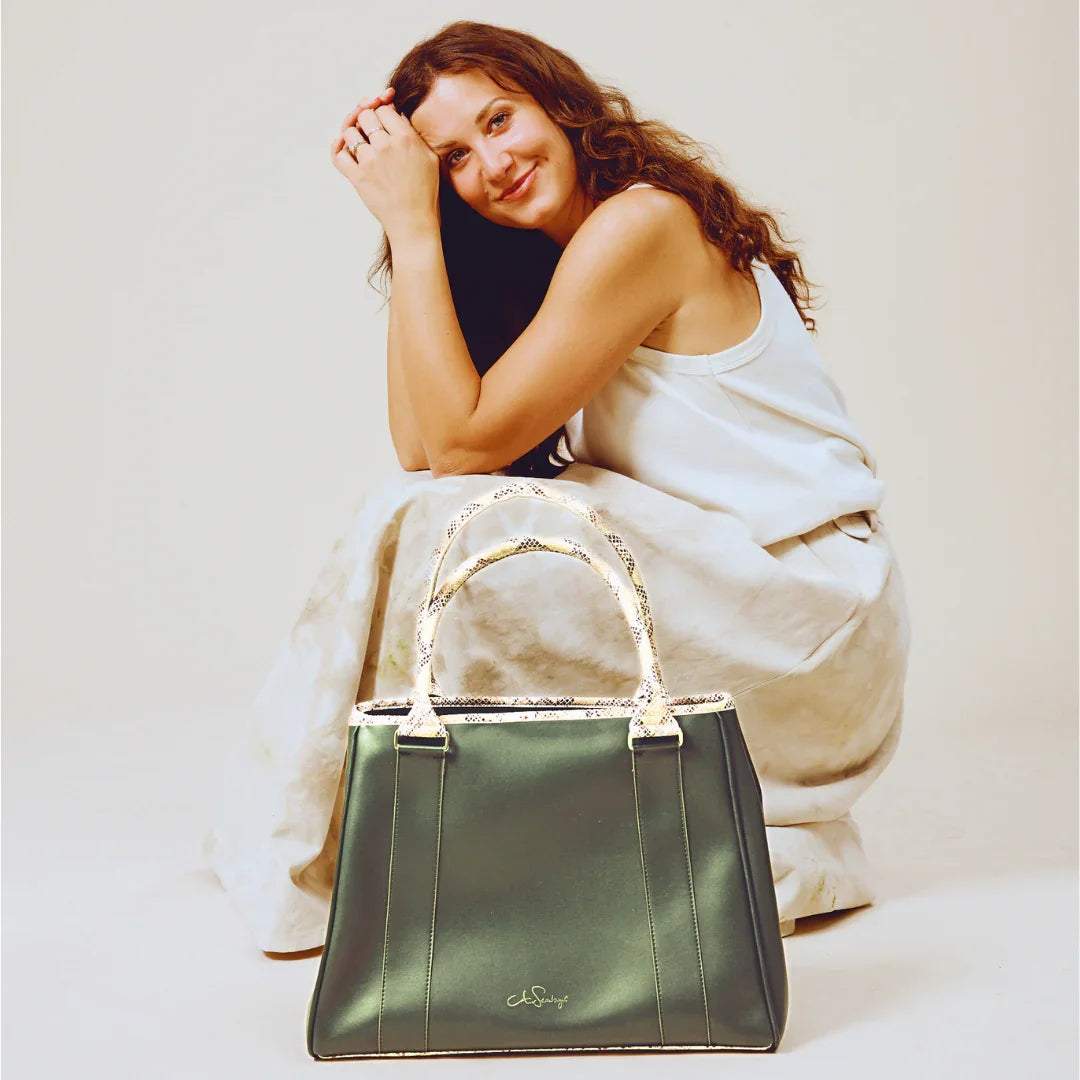 Handtasche aus veganem Leder in Oliv und Snake-Optik mit Details